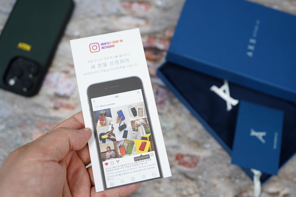 액세스 스튜디오에서는 아이폰뿐만 아니라 갤럭시 케이스, 혹은 에어팟 등의 다양한 액세서리 및 기종 제품도 판매 중입니다. 제품을 개봉할 때 있었던 이벤트 참여 카드를 확인할 수 있었는데 인스타 후기 업로드 시 매달 베스트 3포스팅을 선정하여 쇼핑몰 자체의 적립 포인트를 3만 원 지급한다고 하니 참고 바랍니다.