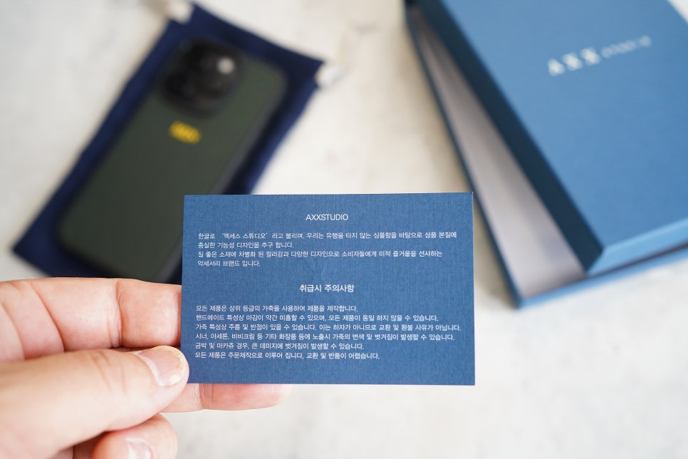 액세스 스튜디오 (AXX Studio)라는 제품인데요. 핸드메이드 방식으로 제작되고 개인이 원하는 이니셜까지 케이스에 새길 수 있습니다. 필자도 커스텀 오더 후 약 2-3일 후에 제품을 받게 되었는데 고급스러운 패키지부터가 벌써 눈길을 끌더군요.