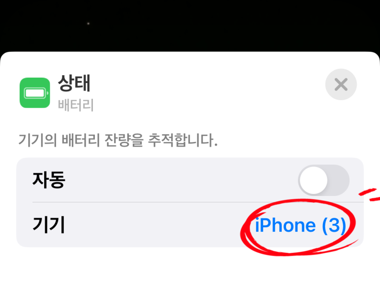 만약 아이폰 배터리 잔량 표시만을 보고 싶을 때에는 이 '자동' 설정 상태를 풀고 아이폰을 지정해 주면 됩니다.