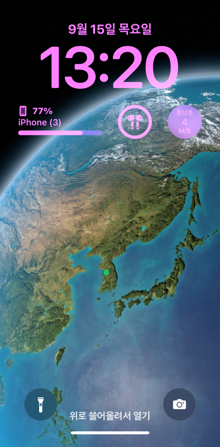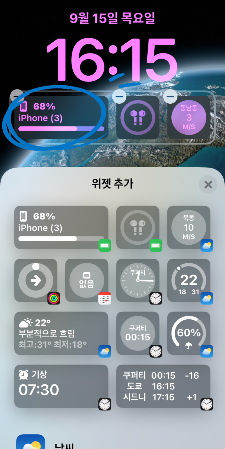 만약 아이폰 기기 상단 배터리에 잔량 표시 (%)가 된다면, 잠금 화면 위젯에는 에어팟이나 애플워치 등을 지정해 놓고 사용하는게 좋을 것 같구요.