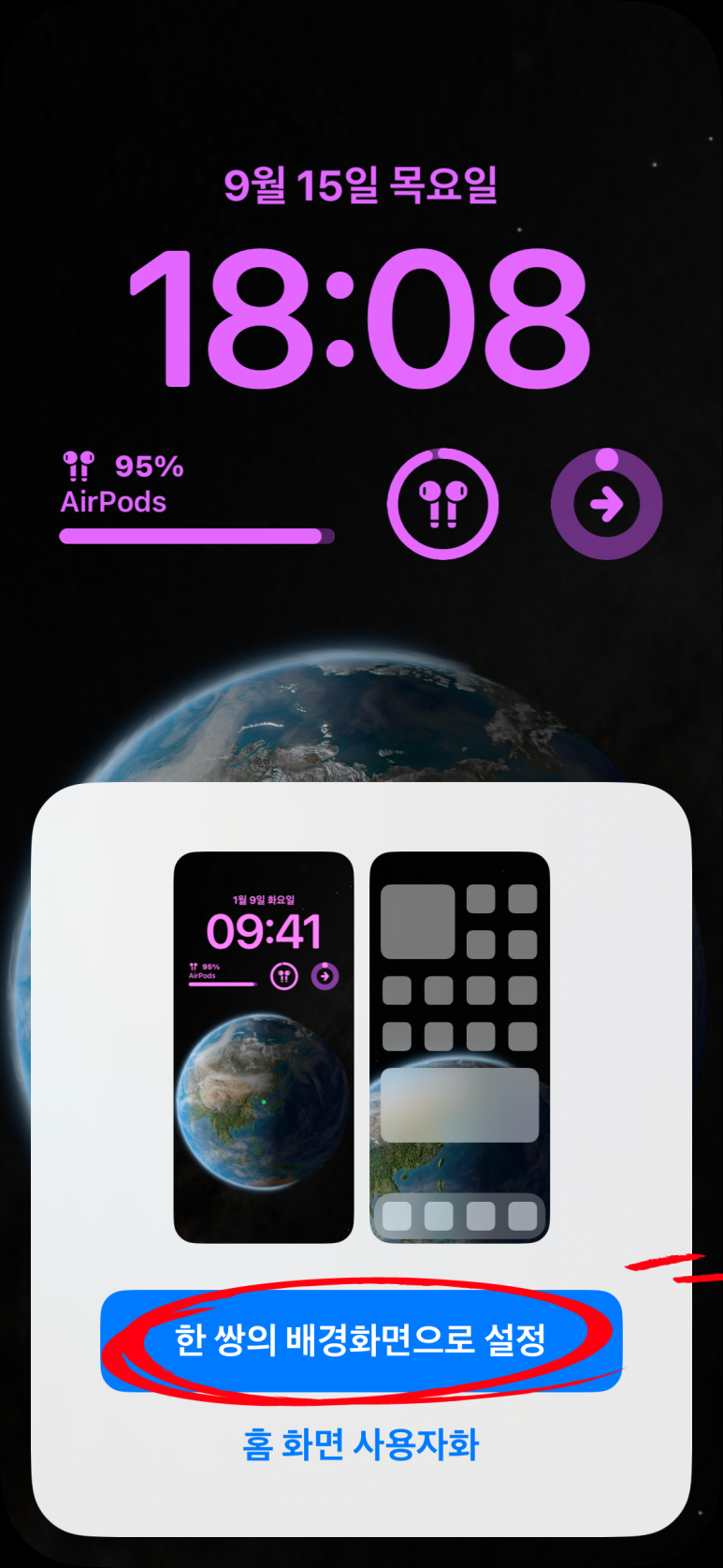 그러면 아래 잠금 화면 저장 옵션이 나오는데, 일단 '한 쌍의 배경화면으로 설정'을 누르세요.