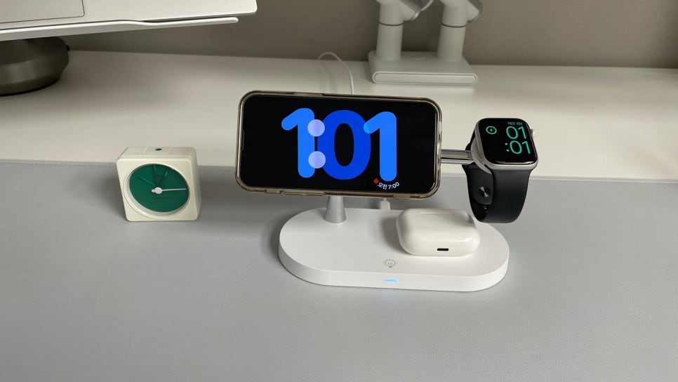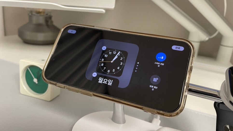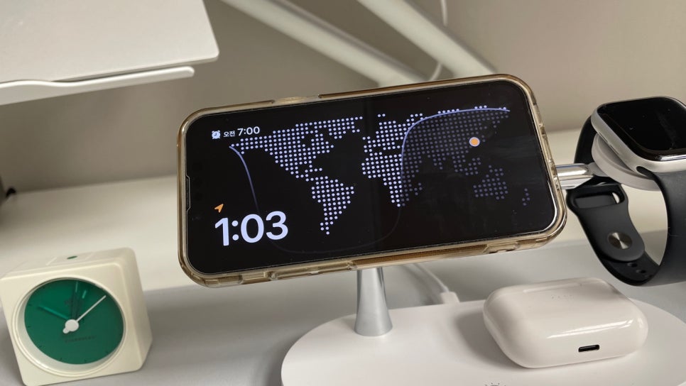 거치가 가능한 충전기를 구입하고 스탠바이 기능을 사용하면 충전과 동시에 시계 역할도 하고 책상 꾸미기도 가능해서 좋아요. 14 이전 모델이 탭을 해줘야만 화면이 나타는 게 조금 아쉽긴 해요.