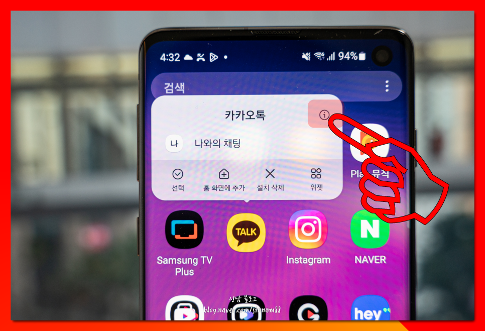 카톡 앱을 찾아 손가락으로 3초간 꾹 눌러 <옵션>을 열어주세요.