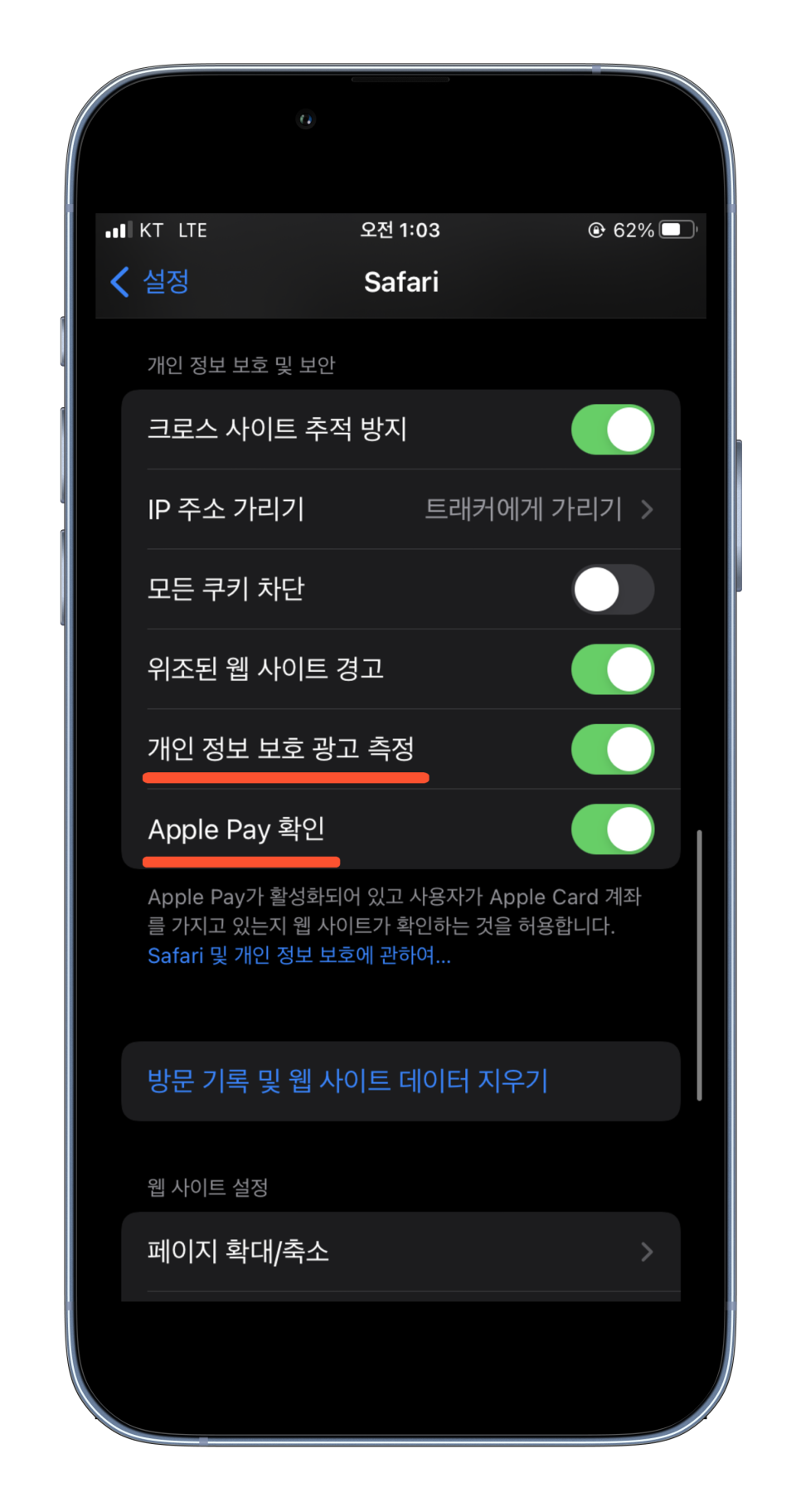10. 개인 정보 보호 광고 측정, Apple Pay 2개다 비활성화로 변경을 해주세요 이렇게 하면 아이폰 발열이 줄어들고 웹 브라우저 이용 시 조금 더 빠르게 검색을 할 수 있습니다.