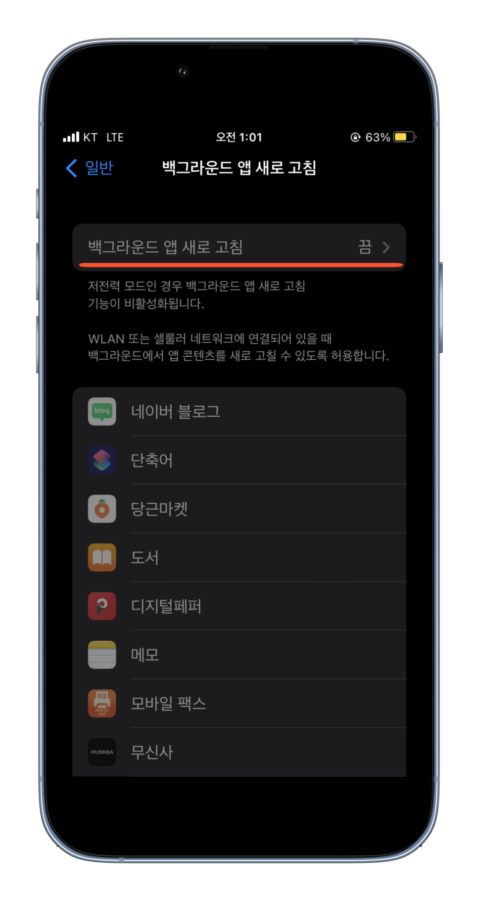 1. 설정에서 일반을 클릭을 해주세요 스와이프하여 아래에 보시면 '백그라운드 앱 새로 고침' 항목을 선택을 합니다.