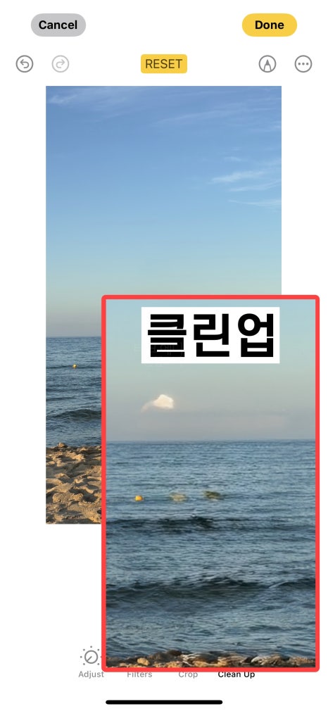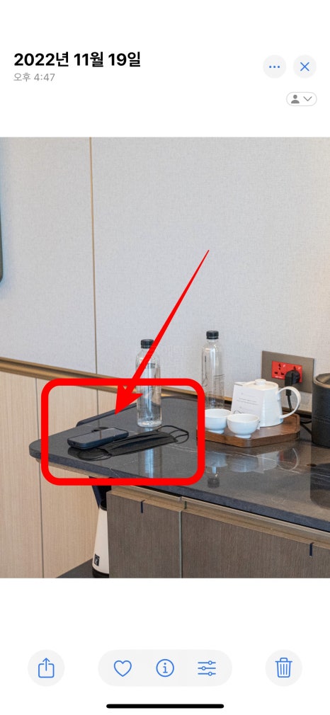 이번에는 아이폰 클린업 기능을 통해 사진 속 비스듬히 놓여있는 물체도 선택해서 지워봤습니다.