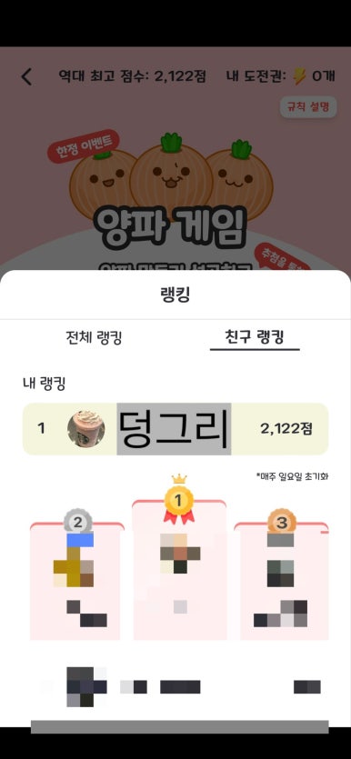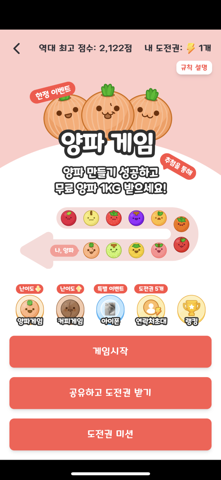 도전권 횟수 제한이 있어서 집중력 갑! 올웨이즈 올팜 맞팜 친구 명수가 중요하 듯, 올팜 양파게임 공유 하고 도전권 얻는 것도 중요해요. 게임이용자들이 직접 고객유치 해오는 굴레인거죠ㅋㅋ