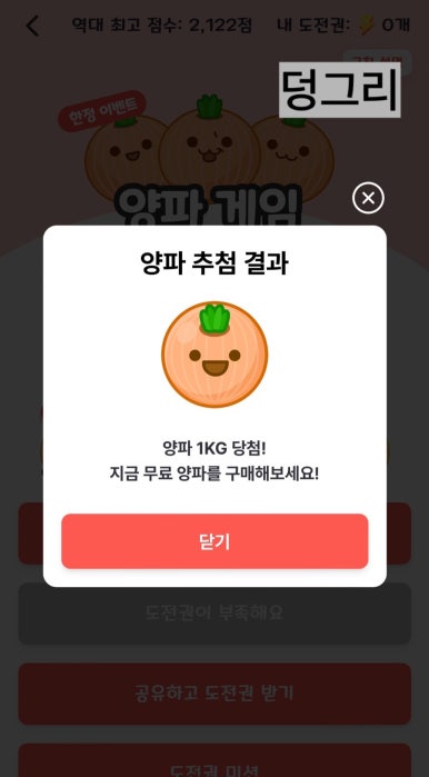 *한 번 수확 당첨 성공하면, 그 뒤 부터는 올팜 양파게임 도전권 공유가 막히더라구요? 대신 자정에 주는 1회권은 들어왔어요.