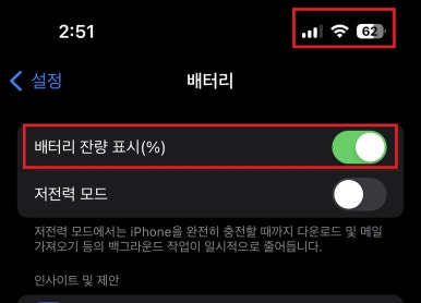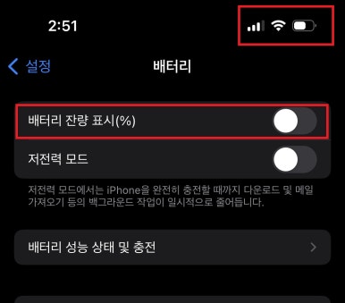남은 배터리 잔량 수치를 아이폰의 상태 막대에