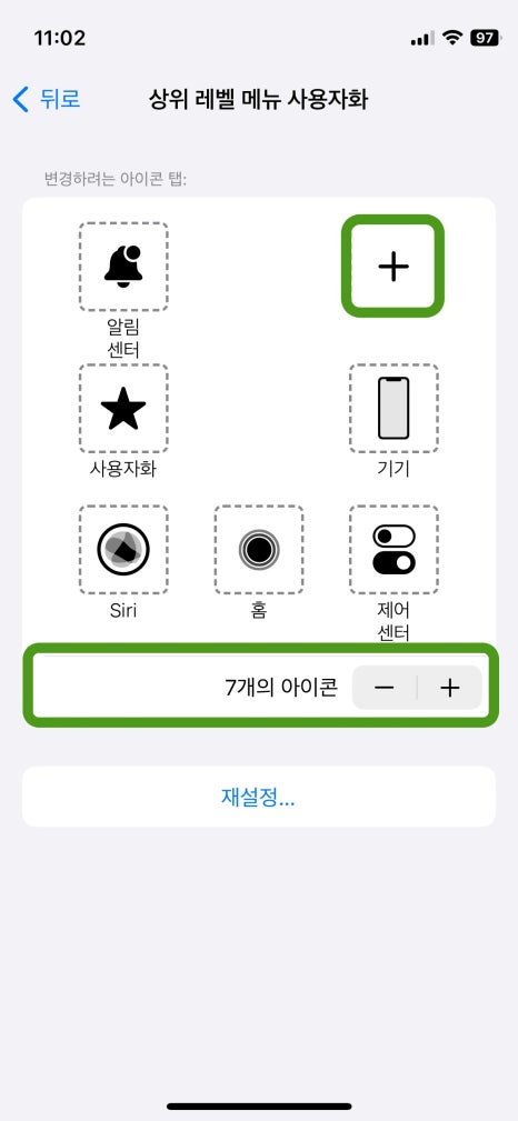 +를 눌러 상위 메뉴 개수를 늘린 뒤, 아이콘을 누르면 원하는 기능을 바로 추가할 수 있다.