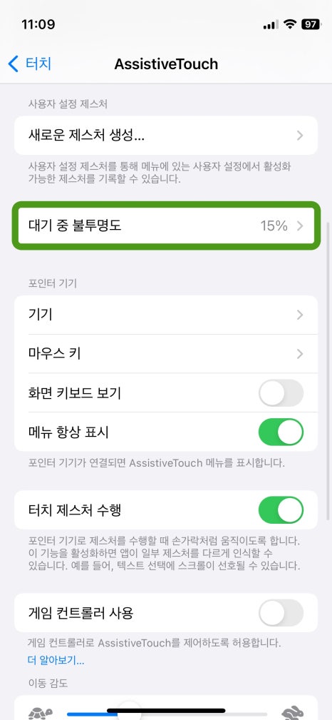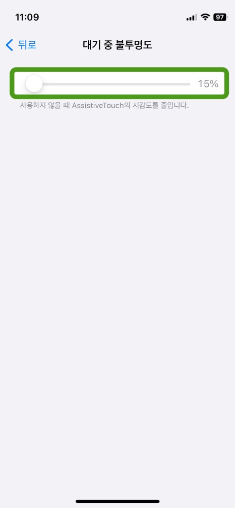 Assistive Touch 설정 화면에서 아래로 스크롤하여, '대기 중 불투명도'를 선택하자.