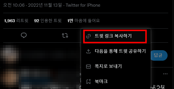 동영상 밑에 다운로드 비슷한 티커를 클릭해 "트윗 링크 복사하기"를 해준다.