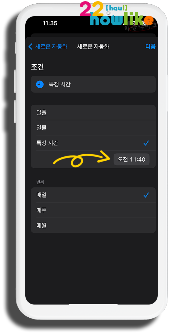 특정 시간에 맞춰 예약 메시지를 보낼 것이므로 특정 시간을 선택하고 메시지를 보낼 시간을 지정해 줍니다. 자동화는 반복이 기본 설정이기 때문에 우선은 반복 설정을 해줍니다.
