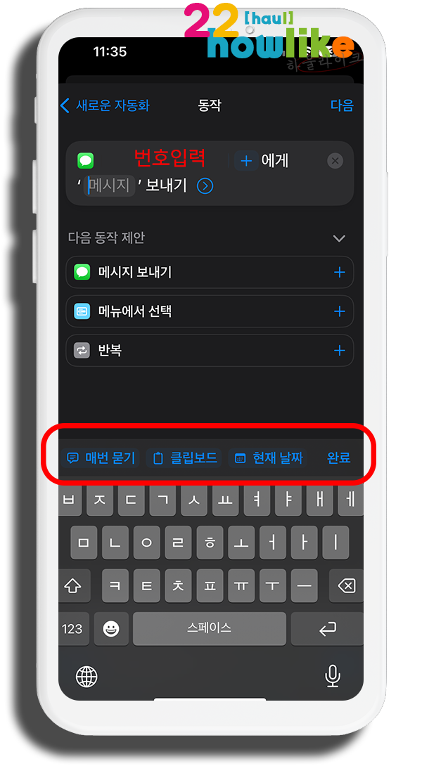 이제 동작을 설정합니다. 특정 시간에 맞춰 동작을 설정할 수 있습니다. 메시지 보내기를 선택하고 메시지를 보낼 수신자를 선택하거나 번호를 입력해 줍니다. 이후 보낼 메시지를 적어줍니다. 이때 메시지는 매번 묻기 / 클립보드 등을 선택하면 그때그때 보낼 메시지를 붙여넣기하거나 새롭게 입력할 수도 있습니다. 저는 메일 확인해라는 내용으로 지정해 보겠습니다.