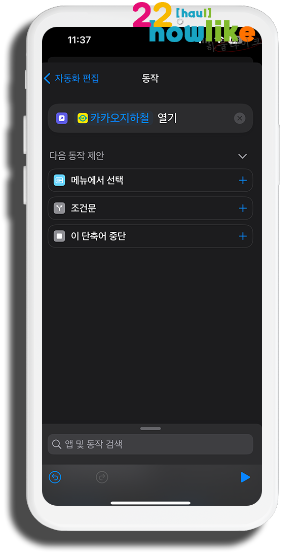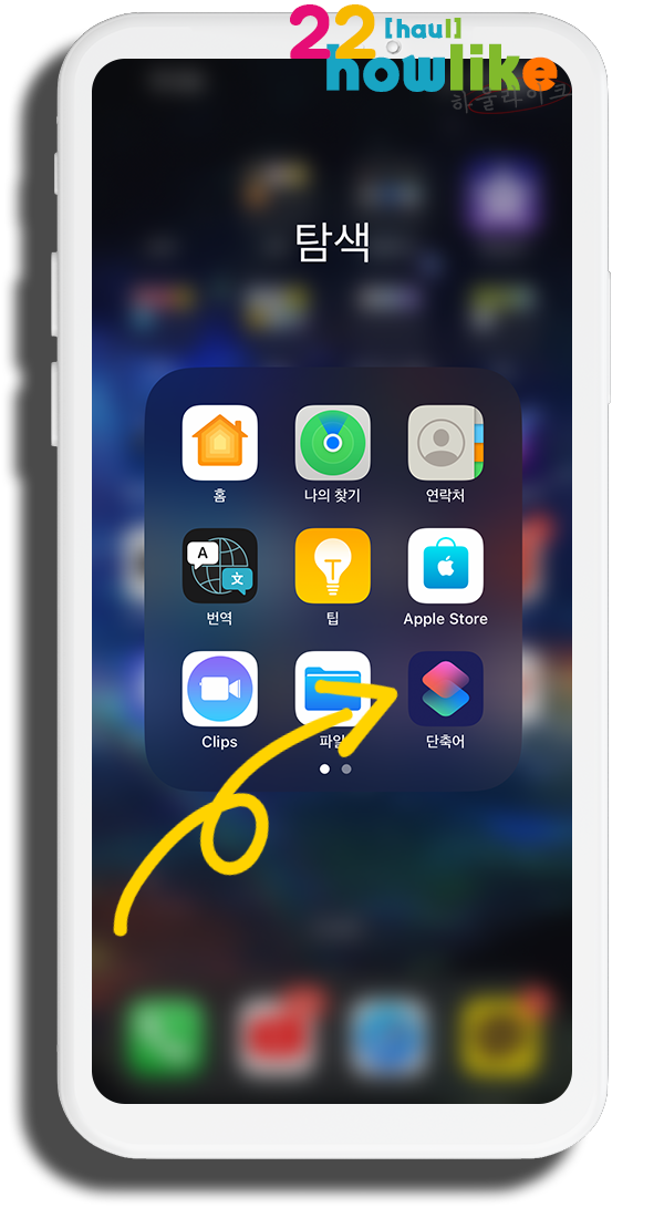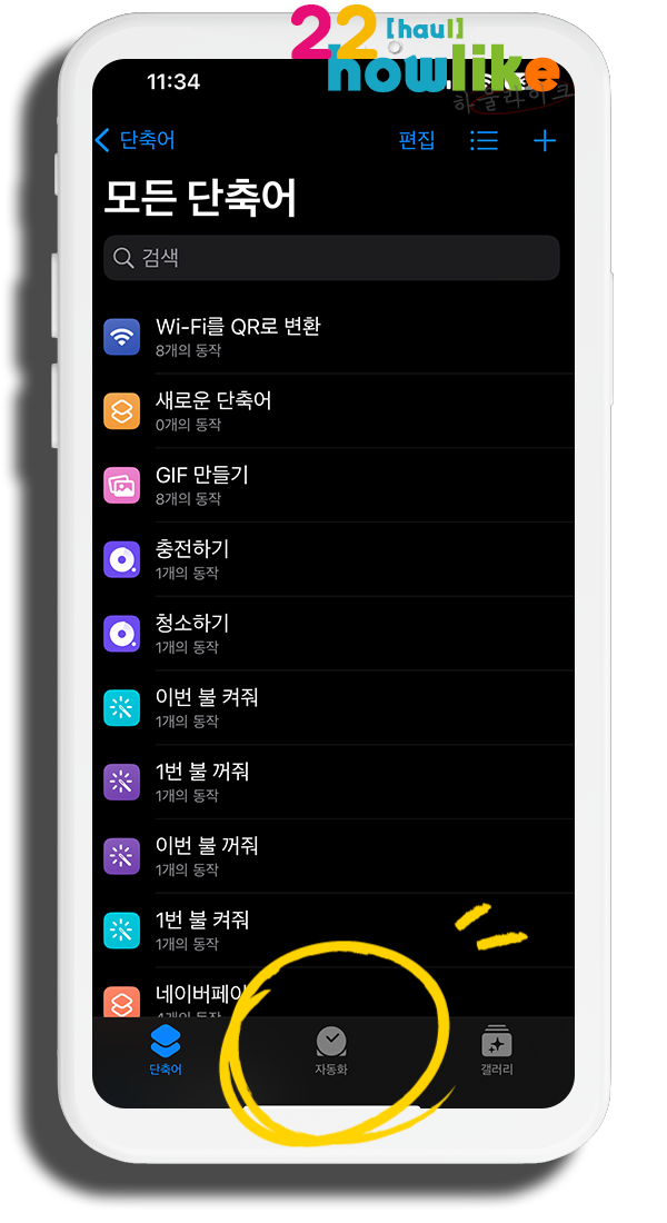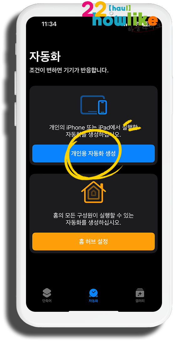 단축어 앱을 실행해 줍니다. 홈 화면에 없을 경우 검색을 통해 실행해 줍니다. 단축어를 실행한 후에 하단 중앙에 있는 자동화를 클릭하고 개인용 자동화 생성 버튼을 눌러줍니다.
