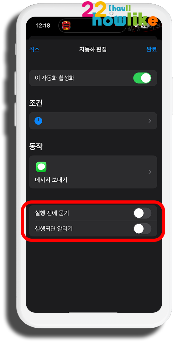 예약 시간과 메시지 내용을 확인했다면 해당 기능을 실행하기 전에 물을지를 정할 수 있습니다. 여기서 실행 전에 묻기를 해제하면 별도의 선택 창 없이 바로 메시지가 전송됩니다. 실행 후에 확인을 하고 싶다면 실행되면 알리기를 선택해 주면 됩니다. 설정이 되었다면 상단의 완료 버튼을 눌러줍니다.