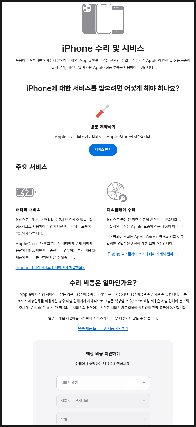 애플 홈페이지 - 수리 및 서비스 페이지에 들어갑니다. '예상 비용 확인하기' 도구를 통해 모델별 수리 비용을 미리 확인할 수 있으니다.