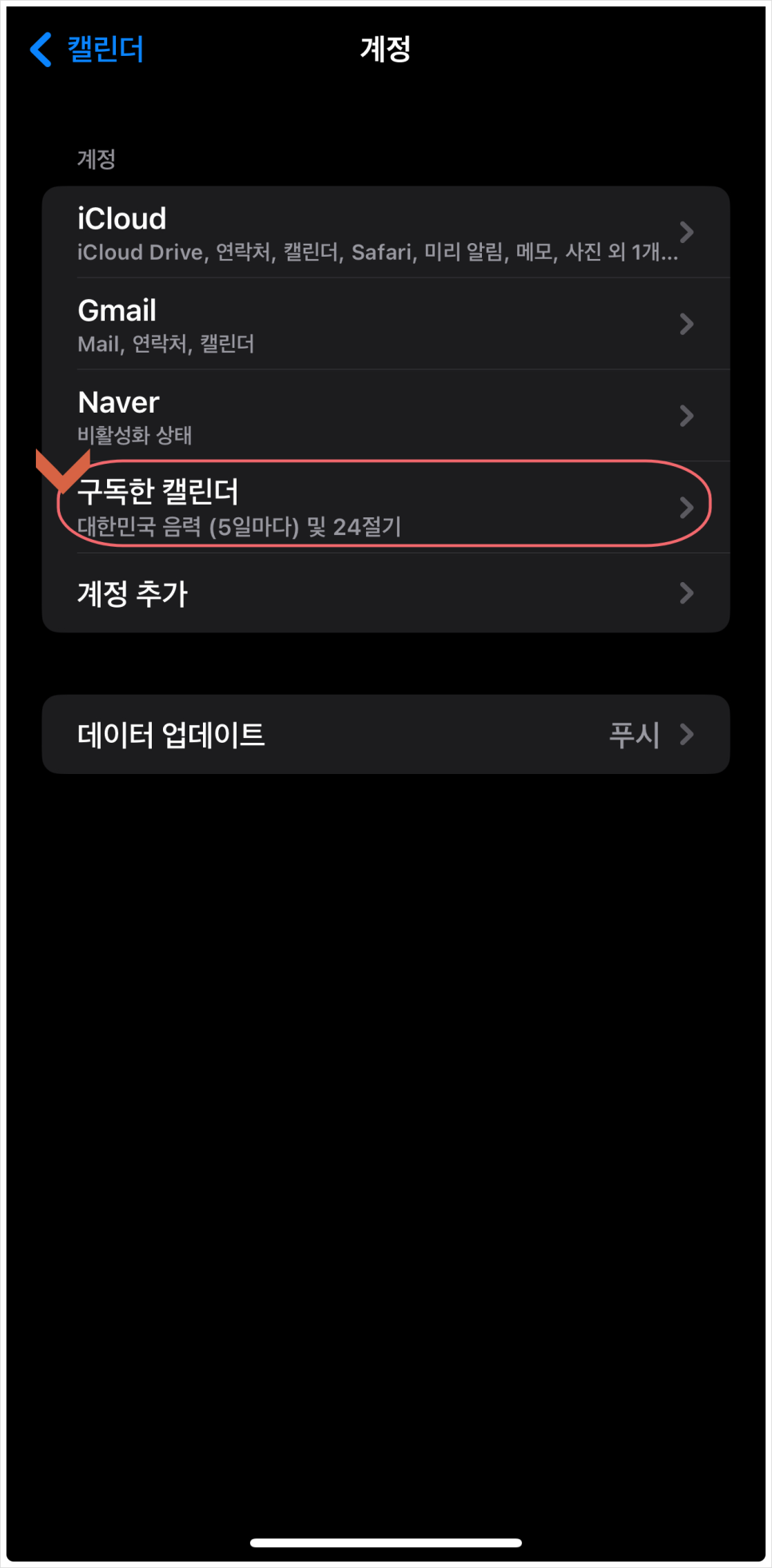 5. 계정 탭 -구독한 캘린더에 '대한민국 음력(5일마다) 및 24절기' 라고 표기됩니다.