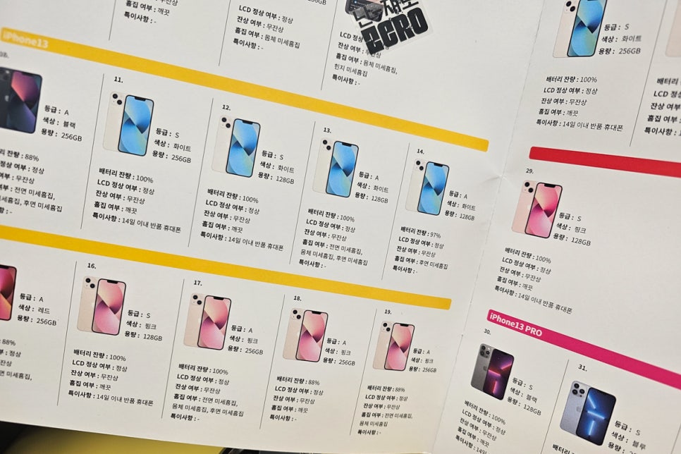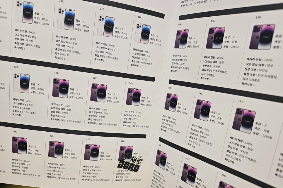기종별로 색상별로 S급과 A급으로 나뉘어 있고 배터리 잔량과 LCD 상태와 잔상 여부, 전면과 후면의 흠집 상태까지 디테일하게 적혀 있어 고유 번호로 분류되어 있더라고요. 14일 이내 반품된 한 번도 개통하지 않은 S급 최신 모델과 전문 인력이 엄격하게 검수한 A급 모델만을 수급한다는 게 우선 믿음이 가더라고요.