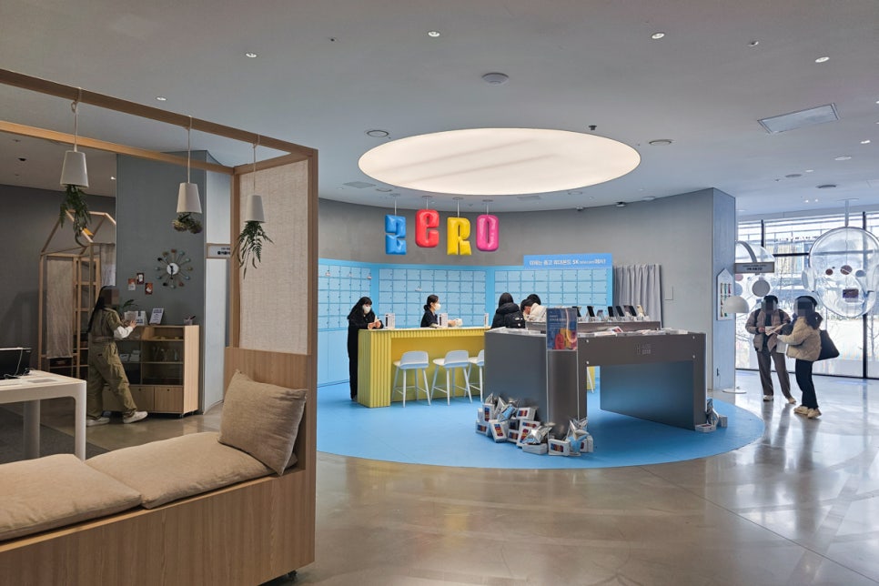 2층의 애플 스토어에서는 최신 아이폰 15 시리즈와 아이패드, 에어팟 시리즈 등을 만나볼 수 있으며 중앙에는 SKT ZERO 팝업스토어가 운영되고 있어요. 역시 학생들의 관심이 쏟아지는 곳이네요.