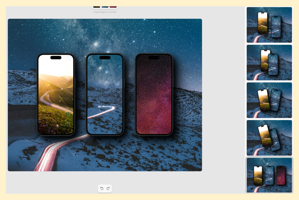 10) 가운데 아이폰 목업에 사용된 사진을 배경으로 선택해서 반영해 봤습니다.