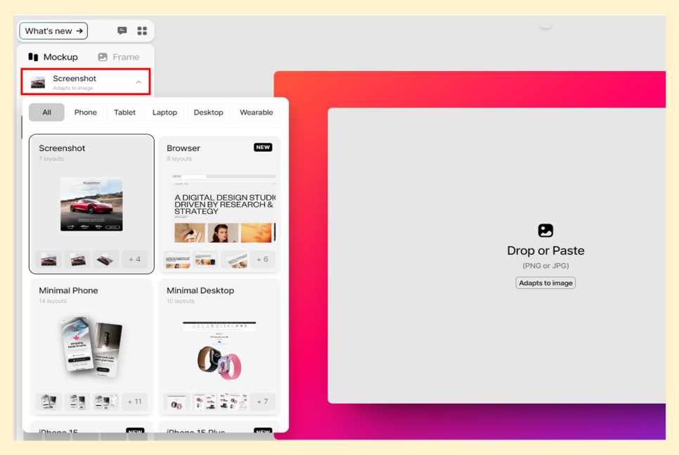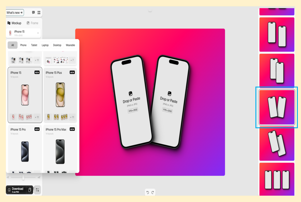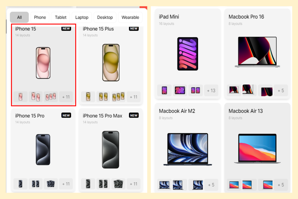 보시면 핸드폰 목업 스마트폰, 태블릿, 랩톱, 데스크톱, 웨어러블 카테고리에서 원하는 스타일을 선택할 수 있습니다.
