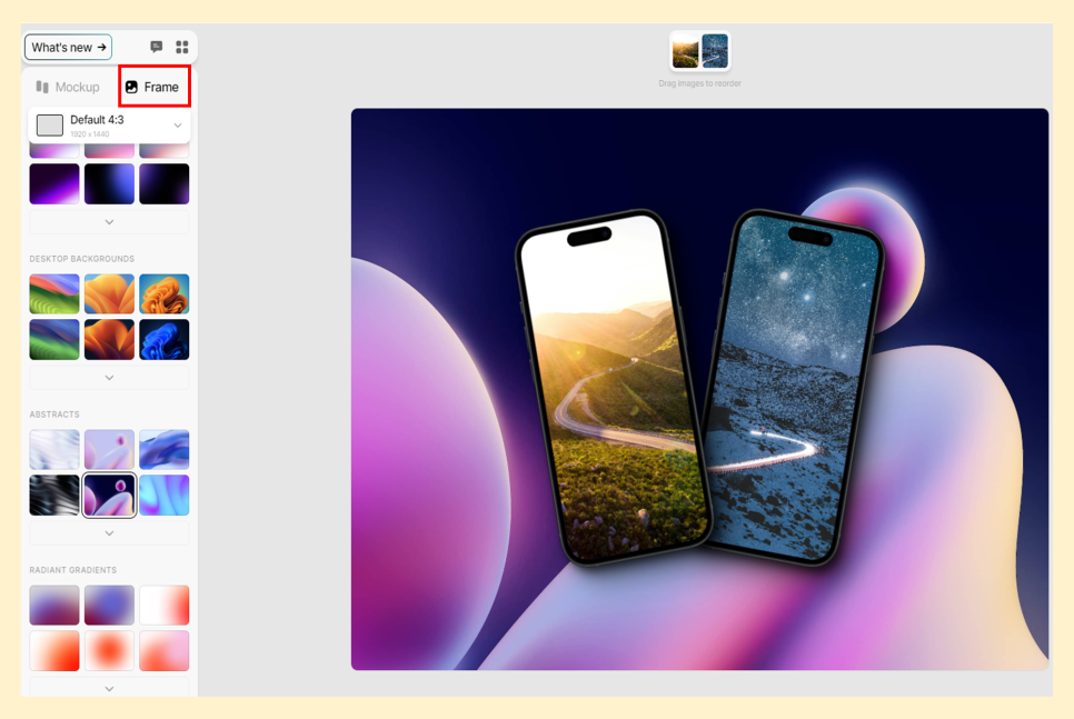 왼쪽 상단 프레임을 선택하면 다양한 무료 배경 이미지를 선택할 수 있습니다.
