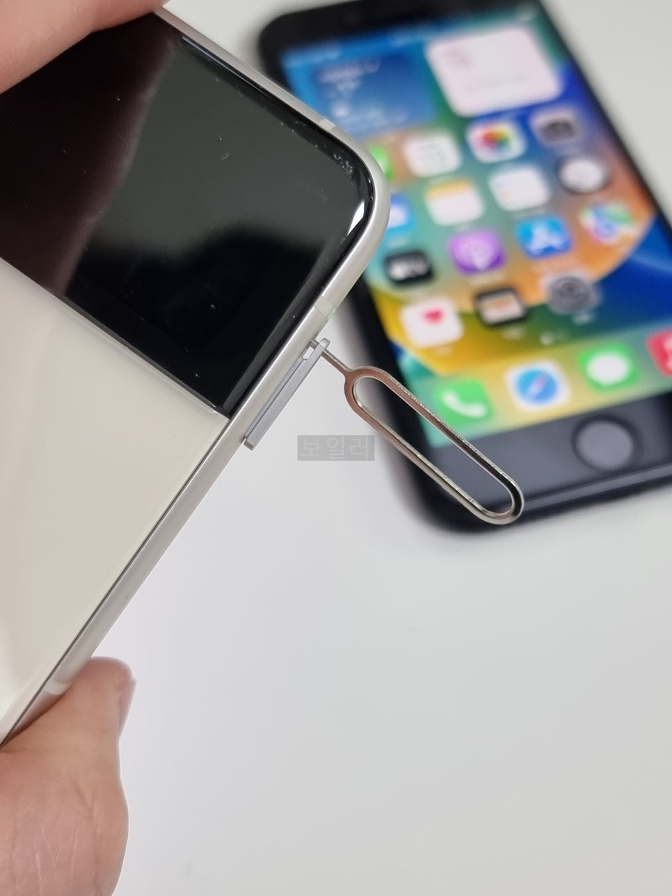 이제 빼낸 유심 트레이에 갤럭시에 빼낸 유심칩을 장착하고 다시 아이폰에 유심칩이 장착되어 있는 유심 트레이를 넣어주면 됩니다.