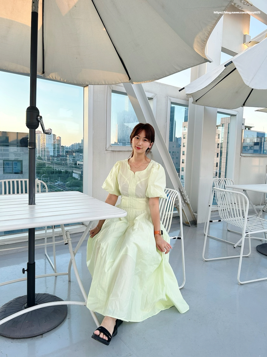 그리고 키가 작다면 앉아서 찍는 팁 중 하나다. 다리를 쭉 내밀어서 길어 보이게 한다던가, 아니면 좌석에 앉은 채로 찍는 게 좋다. 다음컷은 노을이 지는 공간에 찍어봤다. 샤랄라 라임색 원피스를 입었으니 인생 샷을 남겨줬다. 최대한 편하게 미소를 짓거나, 우수에 찬 눈빛을 연기해 봤다. 그랬더니 훨씬 퀄리티가 다르다.