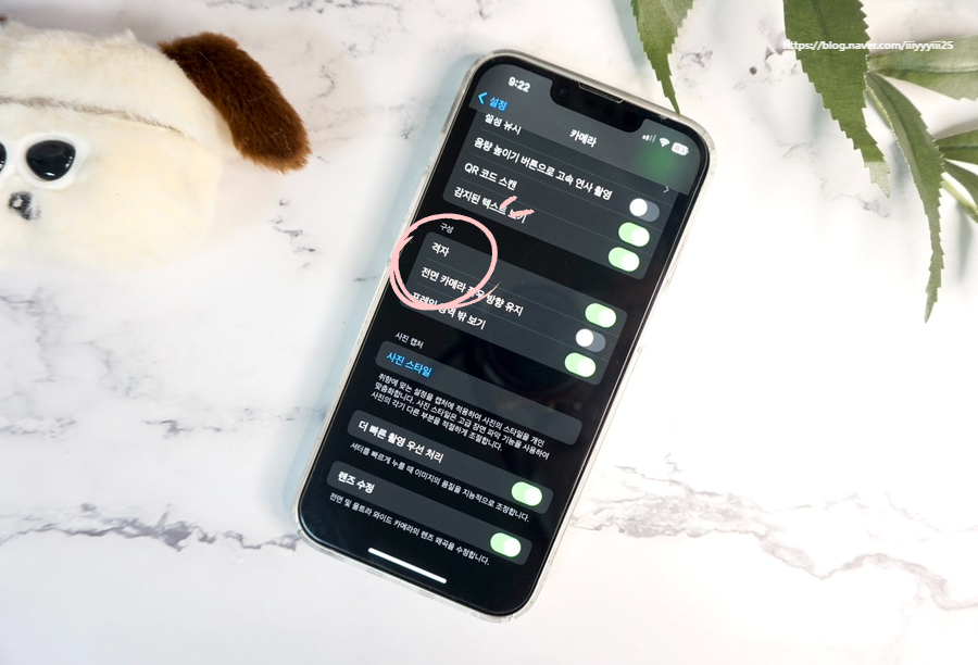 추가로 무언가 어색한데 싶을 때는 좌우뱡향 유지가 활성화되어있을 수가 있다. 영상 촬영하거나, 간판을 찍을 때 무언가 거꾸로 되어있다 싶으면 꼭 한번 체크해 보시길. 셀카 찍을 때도 어색하게 나올 수 있으니 이 부분은 꼭 확인해 보시길 바란다. 되도록이면 꺼두시는 게 자연스럽게 촬영할 수 있는 방법이다. 그리고 켰을 때 핑크색 동그라미를 주목하자. 여기에 이 안에 피사체를 넣으면 더욱 몰입감 있게 찍을 수 있다.