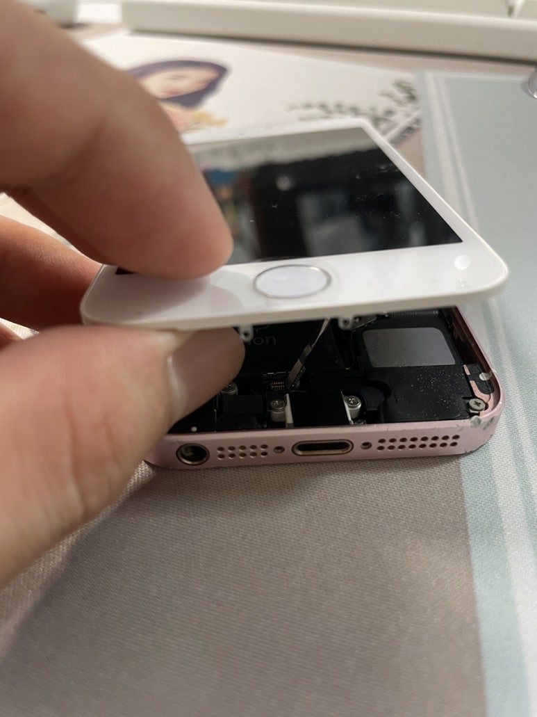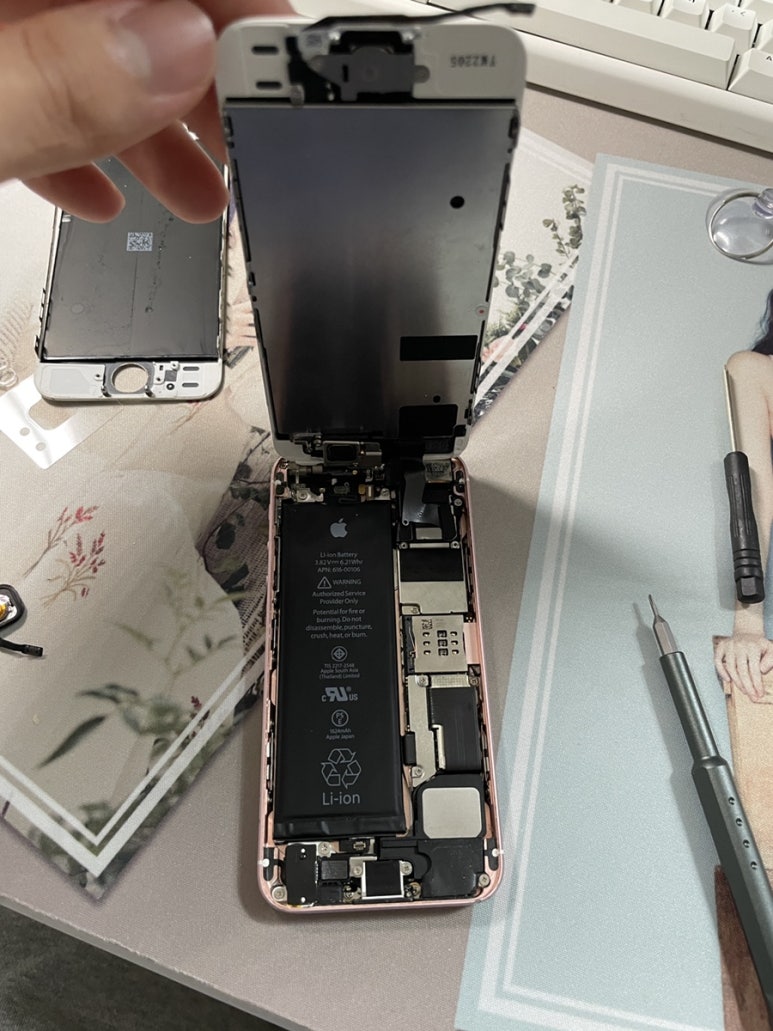 열게되면 원래 하단에 홈버튼 케이블이 있어야 하지만 제가 이전에 실수로 끊어버렸기 때문에 상단의 디스플레이 케이블만 보입니다.