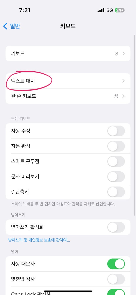 텍스트 대치라는 설정은 카톡, 문자등에서 자주