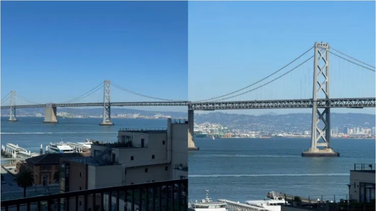왼쪽: iPhone 15 Pro Max로 촬영한 2배 줌 사진. 오른쪽: iPhone 15 Pro Max로 5배 줌 촬영.