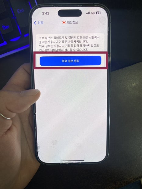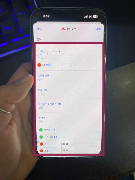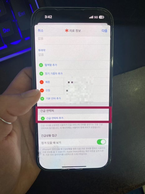 화면 하단 건강 앱에서 긴급 연락처 설정을 누르시고 의료 정보 생성 기능까지 눌러주면 아래 화면과 같이 이름, 생년월일, 혈액형, 체중, 신장 등등 정보를 입력하는 창이 보이고