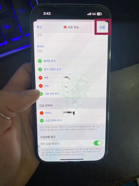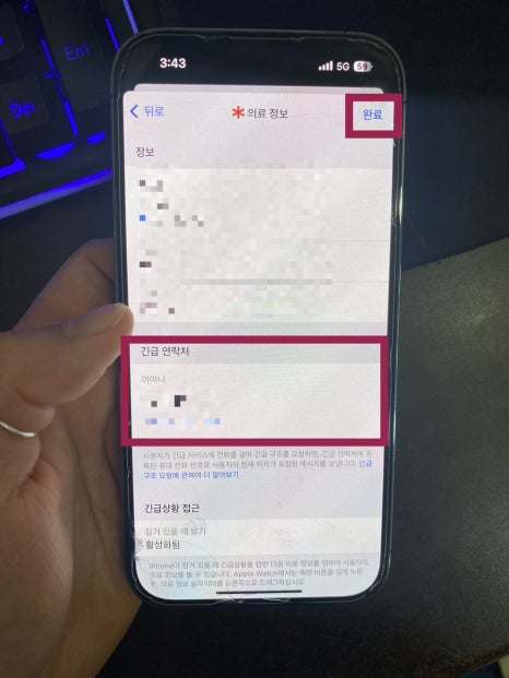 이렇게 추가가 된 것을 확인할 수 있고 다음을 누르시면 내가 입력한 정보와, 긴급 연락처가 정리된 화면에 우측 상단 완료를 누르시면 끝입니다!