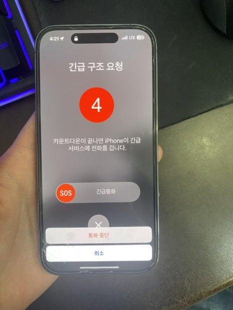 취소 방법으론 양쪽 버튼을 동시에 눌렀다 떼시면 자동으로 종료가 되며 빠르게 버튼을 5번 누른 경우는 화면 하단 중단 표시를 누르시면 통화 중단이 나타나게 되고 버튼을 누르면 취소가 되는 걸 볼 수 있습니다.