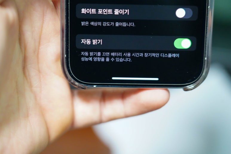 이는 설정앱에 접근하여 손쉬운 사용 메뉴를 클릭하였을때 보여지는 디스플레이 및 텍스트 크기 항목 내 가장 하단에 위치해 있으며, 터치를 이용하여 활성화 비활성화를 유지할수 있습니다. 아이폰 자동 밝기 기능 사용시, 배터리 사용 및 디스플레이를 보다 효율적으로 사용할수 있으니 개인적으로 사용함을 추천드립니다.