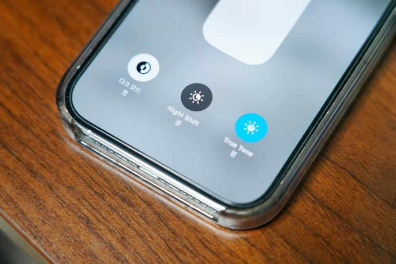 추가로 아이콘을 꾹 누르게 되면 다크 모드, Night Shift, True Tone 3가지 항목을 확인할수 있는데 필요하다면 클릭하여 활성화, 그렇지 않다면 다시한번 클릭하여 비활성화 후 사용할수 있습니다. 다크모드란 말 그대로 어두운 디자인의 모습을 말하며, Night Shift는 시간에 맞춰 디스플레이 색감을 변경하는 기능을 말합니다. 마지막으로 True Tone은 주변 환경에 맞춰 색을 변경하는 기능이니 사용자 환경에 맞춰 사용하시길 추천드립니다.
