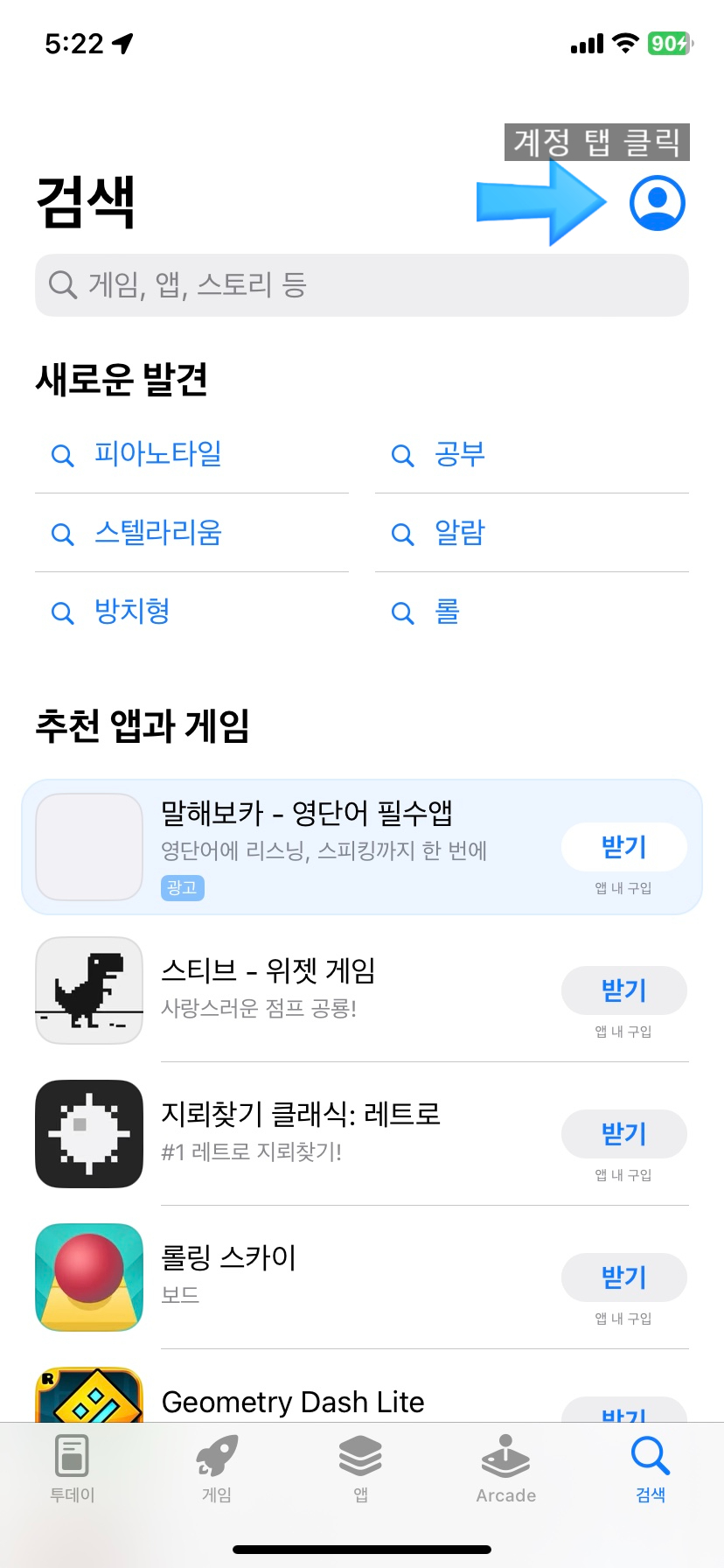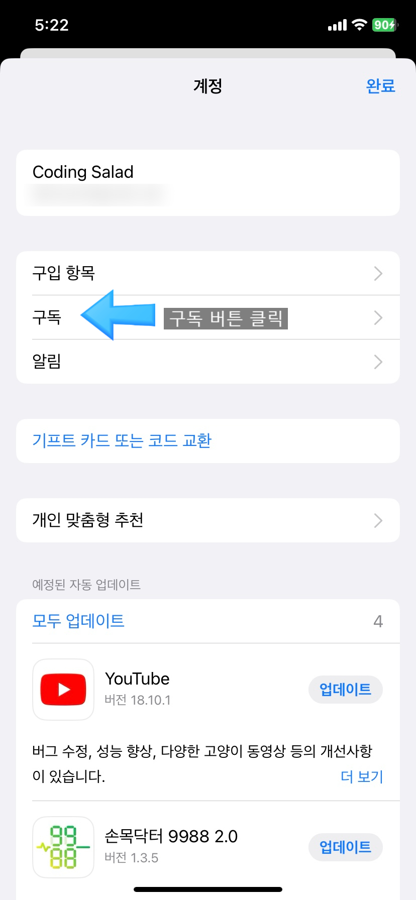 앱스토어를 실행하고, 우측 상단에 계정을 클릭합니다. 그러면 로그인 된(구독이 신청된) 계정을 확인할 수 있습니다.