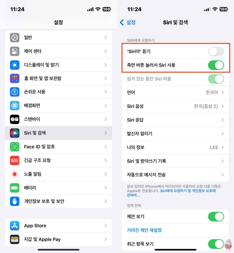 이 설정은 스피커로 말하는 시리야로는 실행되지 않고 측면 버튼(잠금버튼)을 길게 눌러서 시리를 호출하는 방법이다.