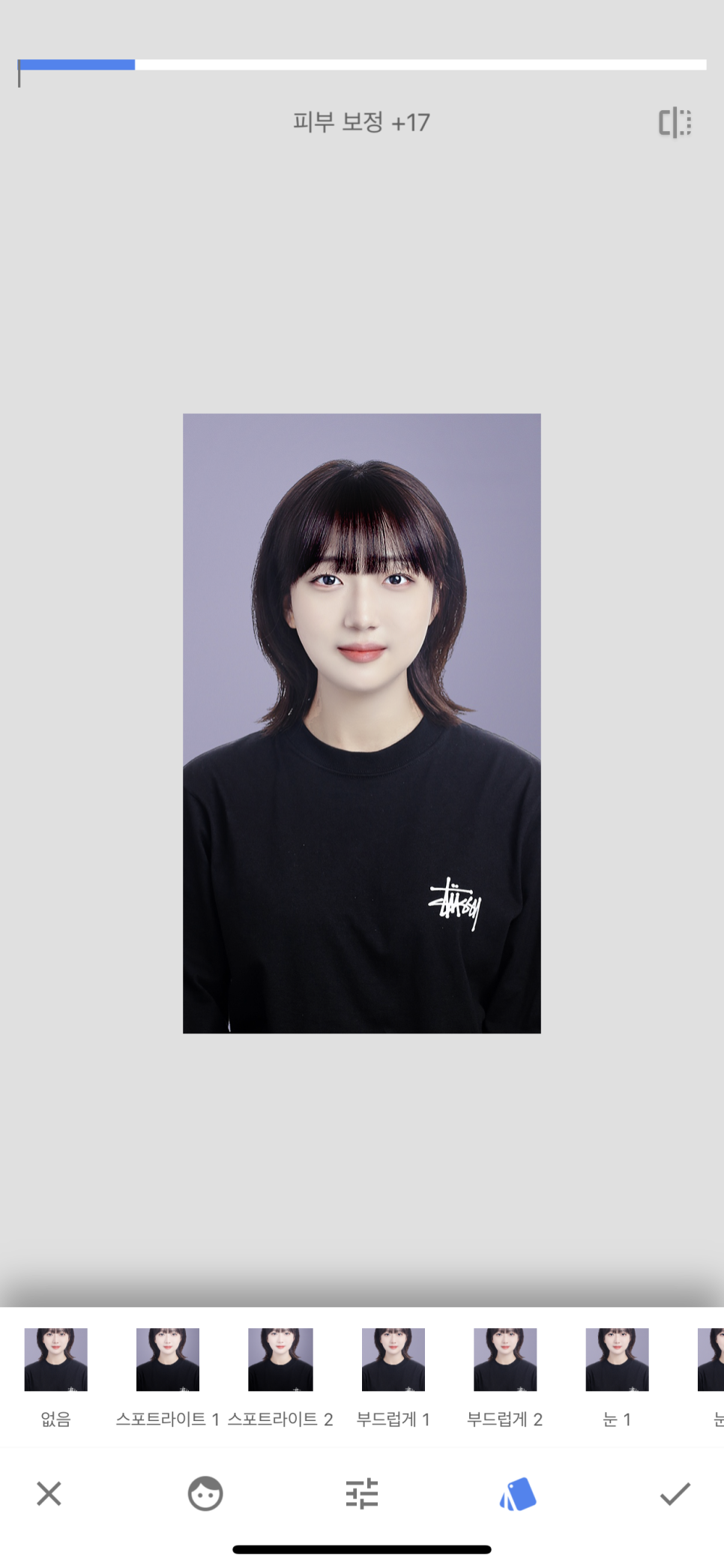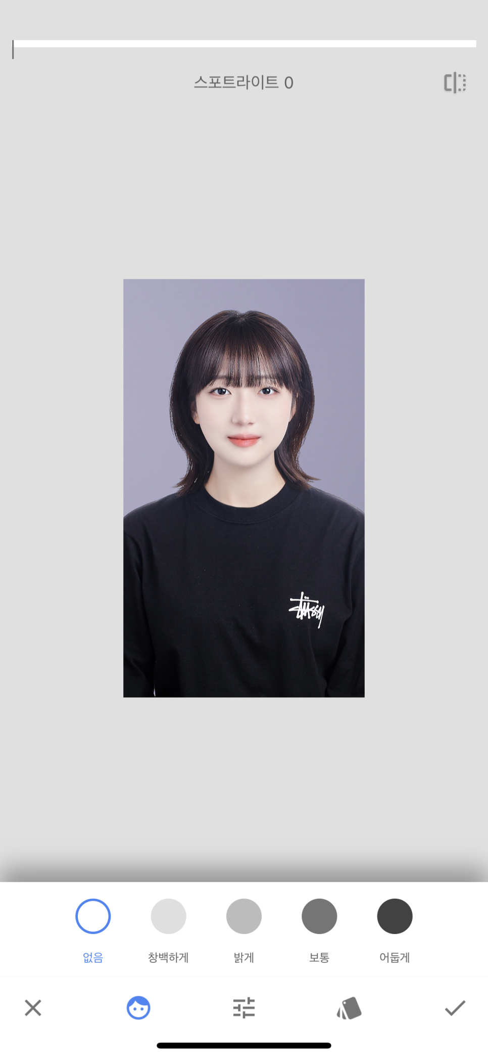 인물사진에 들어가시면 하단에 사람얼굴모양을 누르시면 피부 느낌을 선정할 수 있는 곳이 보입니다. 없음, 창백하게, 밝게, 보통, 어둡게 이렇게 나뉘어 있어요. 눌러 보시면 달라지는 것을 바로바로 보실 수 있어요. 원하는 느낌에서 멈추시면 됩니다.