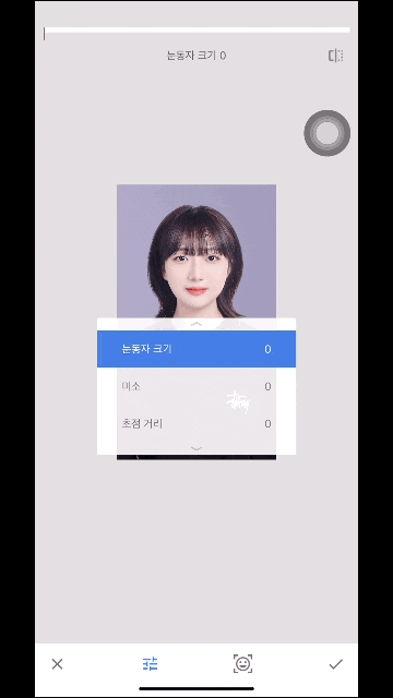 이제 얼굴 방향 메뉴입니다. 아까 보였던 여러 메뉴 중에 얼굴 방향을 눌러보세요. 그럼 하단에 두 가지 버튼이 보이는데 그중 좌측에 있는 버튼에는 눈동자 크기와 미소, 초점거리가 있습니다.