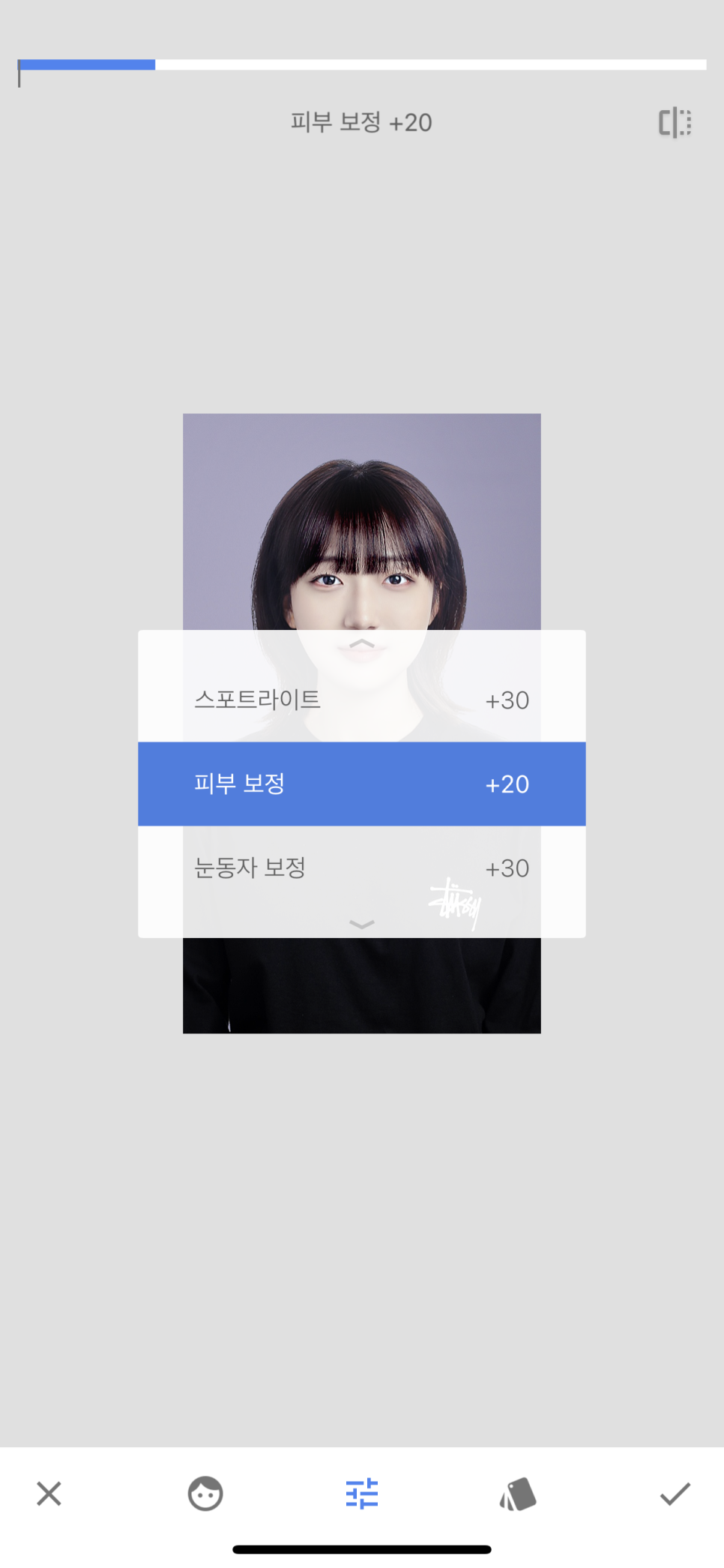 피부 보정은 피부를 부드럽게 하는 효과입니다. 피부 톤을 뭉개는 느낌이라고 생각하시면 됩니다. 여기도 마찬가지로 좌우로 드래그하시면서 수치를 설정해 주세요.