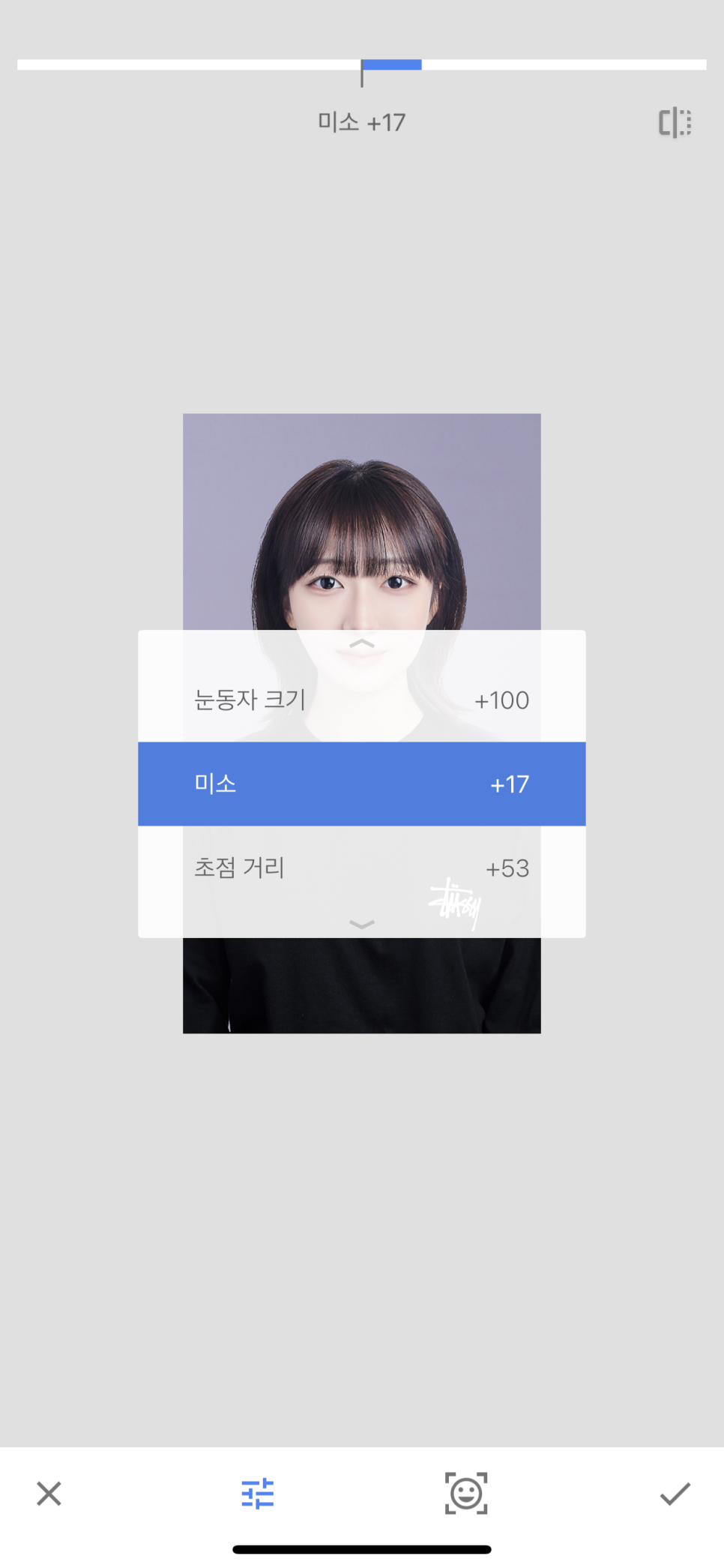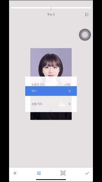 초점거리를 궁금해하실 거라 생각해요~ 광각과 줌의 효과라고 생각하시면 됩니다. 광각은 얼굴을 크게 만들고 줌렌즈 효과는 얼굴이 작아 보이는 효과를 만들어 냅니다. 일반적인 뷰티 앱에서 턱을 줄이거나 하는 효과는 없지만 자연스럽게 피부와 눈, 미소 등을 수정할 수 있어 좋아요.