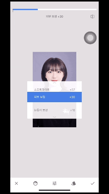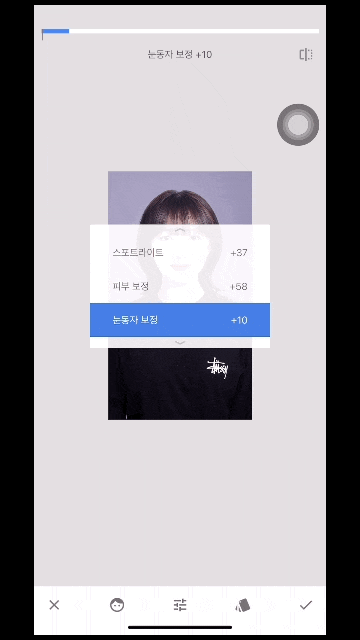 하단에 가운데 있는 부분을 누르면 스포트라이트, 피부 보정, 눈동자 보정 이렇게 3가지 메뉴가 보입니다. 화면을 손으로 누르시고 위, 아래로 드래그하시면서 선택하실 수 있어요.