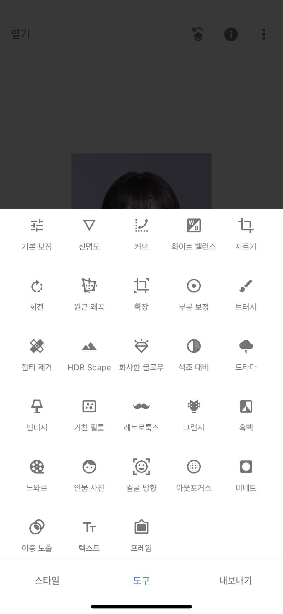 도구라는 곳을 누르면 복잡해 보이는 여러 가지 메뉴들이 보입니다. 이렇게 많은 기능을 사용할 수 있는 앱이기에 오늘은 인물사진하고 얼굴 방향만 설명해 드릴게요. 담번에 하나하나씩 자세히 설명해 드립니다. 기다리세요!