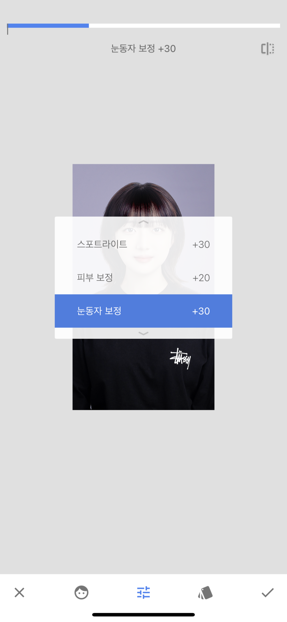 눈동자 보정은 눈의 흰자위를 더 하얗게 하는 효과입니다. 눈이 선명해 보이는 느낌을 얻을 수 있어요. 여기도 수치 조정하시면 됩니다.