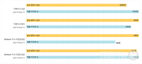 내용에 포함된 벤치마크 테스트에서는 싱글 테스트에서는 갤럭시S23이 1550점, 아이폰14는 1733으로 아이폰의 성능이 더 좋았고, 멀티 테스트에서는 삼성이 5002점, 아이폰14가 4648점으로 갤럭시S23의 점수가 더 높았다.