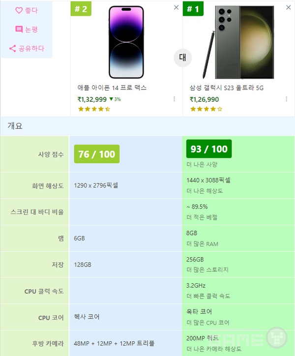 아이폰14와 갤럭시S23 비교 /스마트프릭스(smartprix)