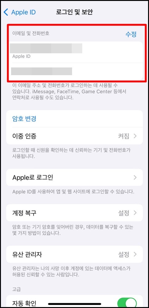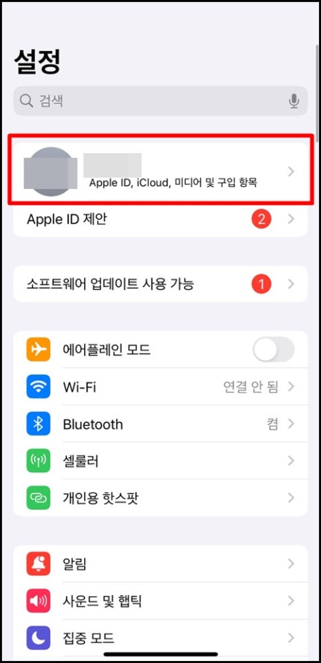 3. 이렇게 해도 문제가 생긴다면 설정 상단에 애플 아이디 항목을 확인해 보아요.